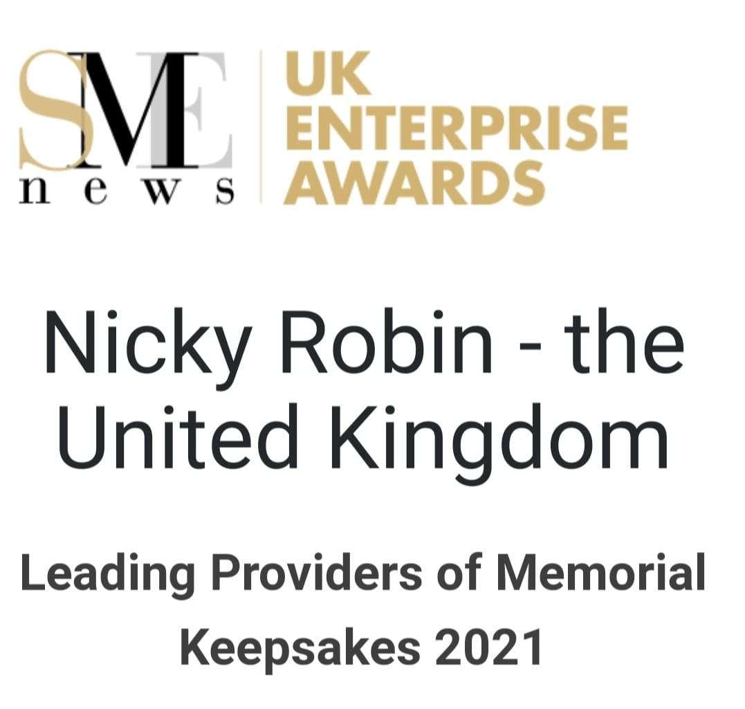 From all of the nominations received, Nicky Robin has been chosen as a winner in the SME UK Enterprise Awards, receiving the title of 'Leading Providers of Memorial Keepsakes 2021'.