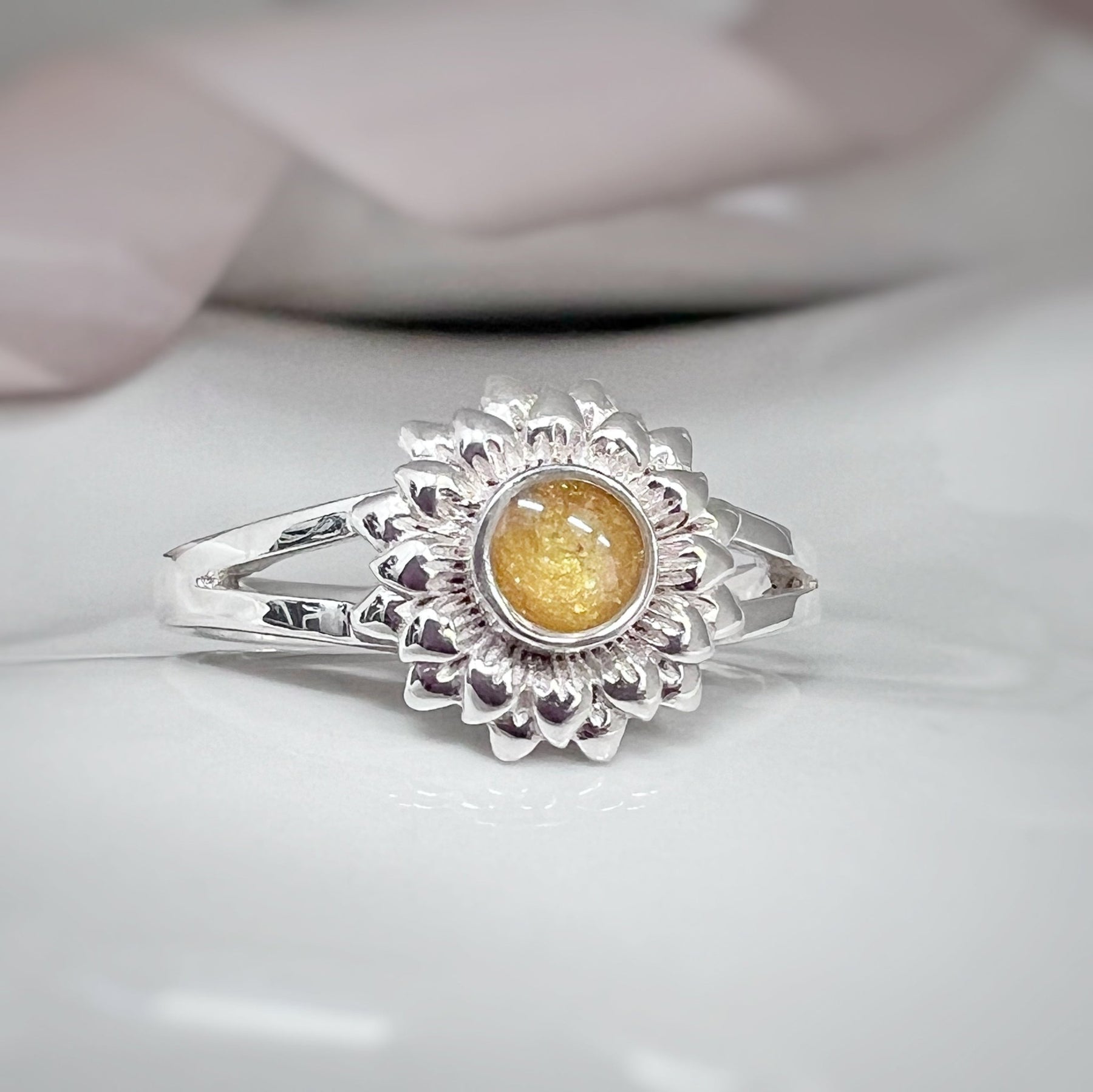 Regular price £195.00Intricate detailed sunflower design memorial ring made with ashes, hair, fur or horsehair in remembrance of a loved one or beloved pet. This pretty memorial ring will be crafted with inclusions placed inside the 4mm centre. This ring also have double shoulders either side.