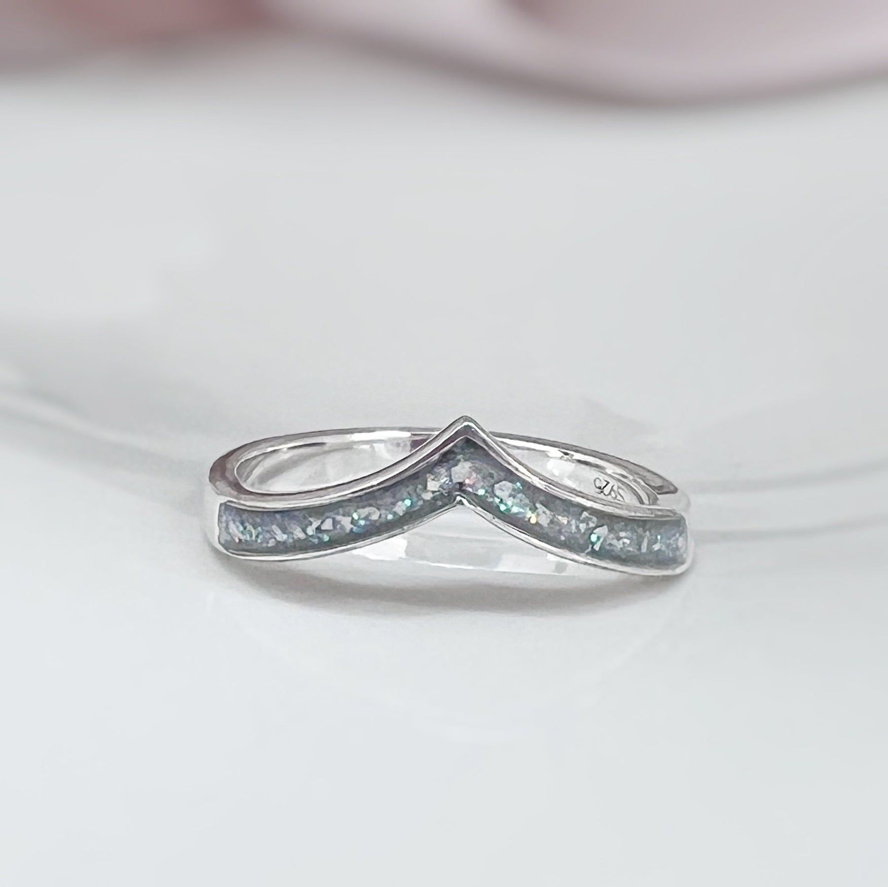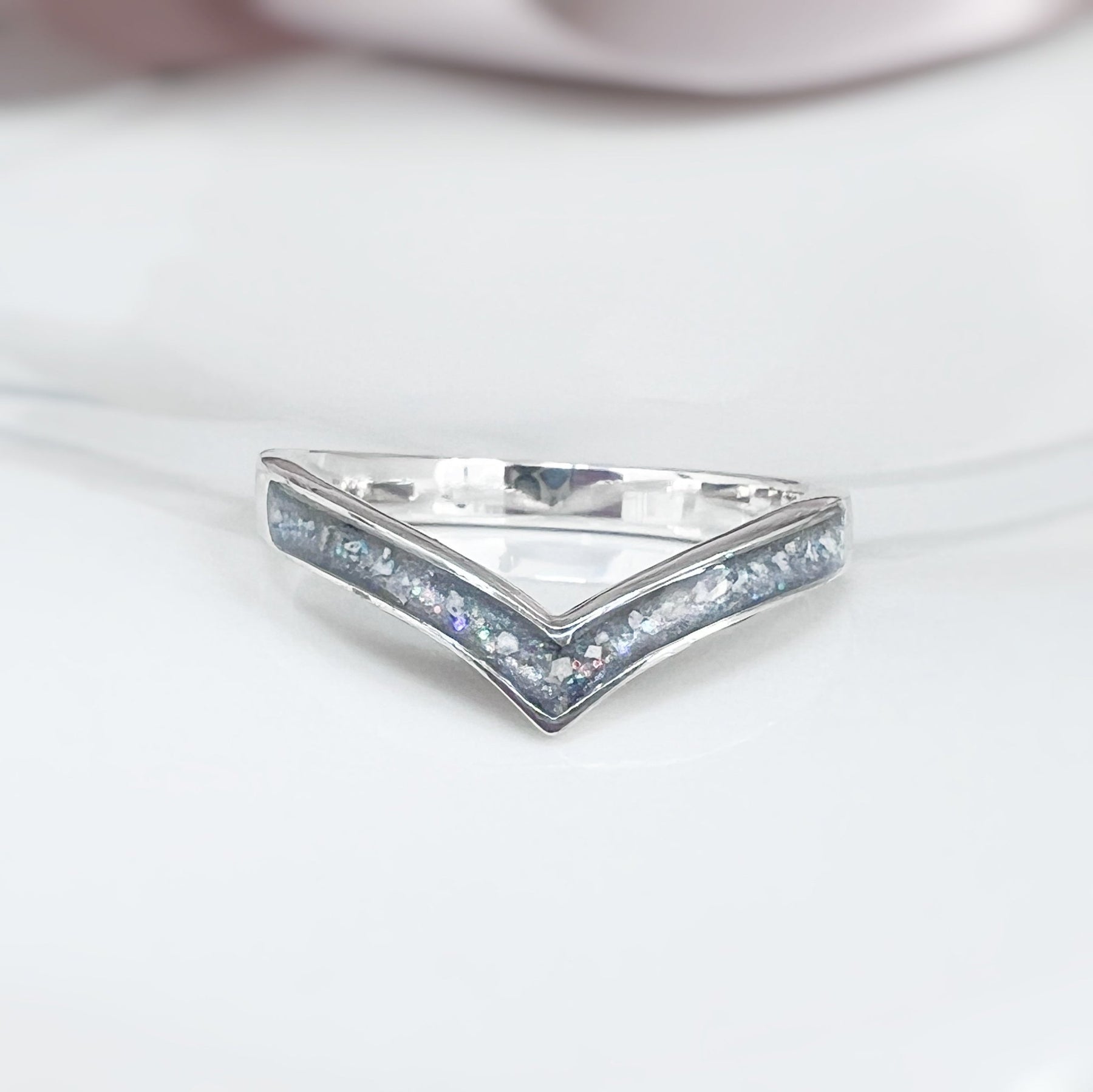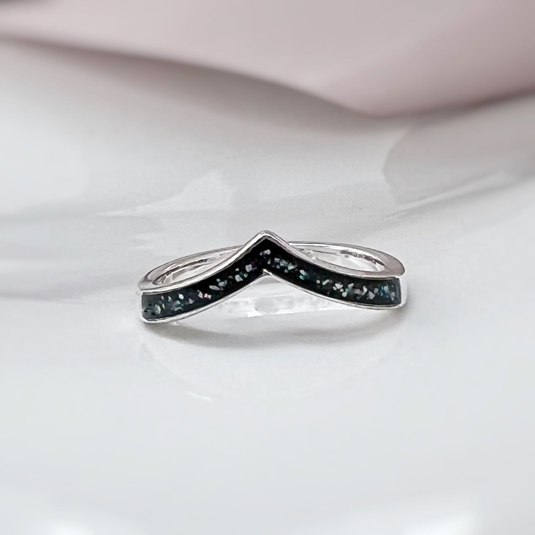 This wishbone design memorial ring is classic yet stylish and has a slender setting along the wishbone where the ashes, hair, fur or horsehair of your loved one or pet will be placed.  The setting measures approximately 12mm at it's widest point and is 1mm wide.