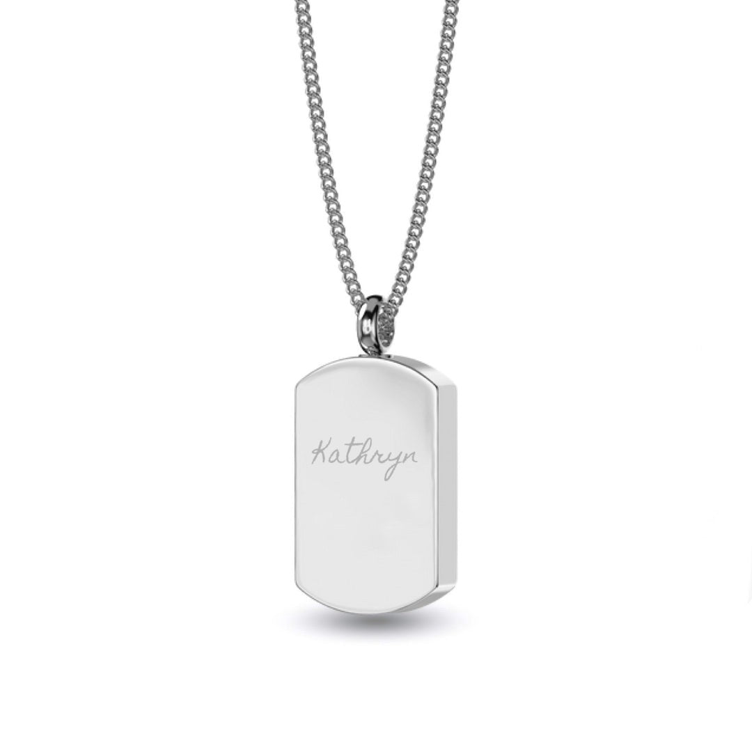 Engraved tag shaped self fill ashes urn necklace with any name, text or date on the front side. Made from quality polished stainless steel.  There is also an option to add an engraved message on the reverse side.
