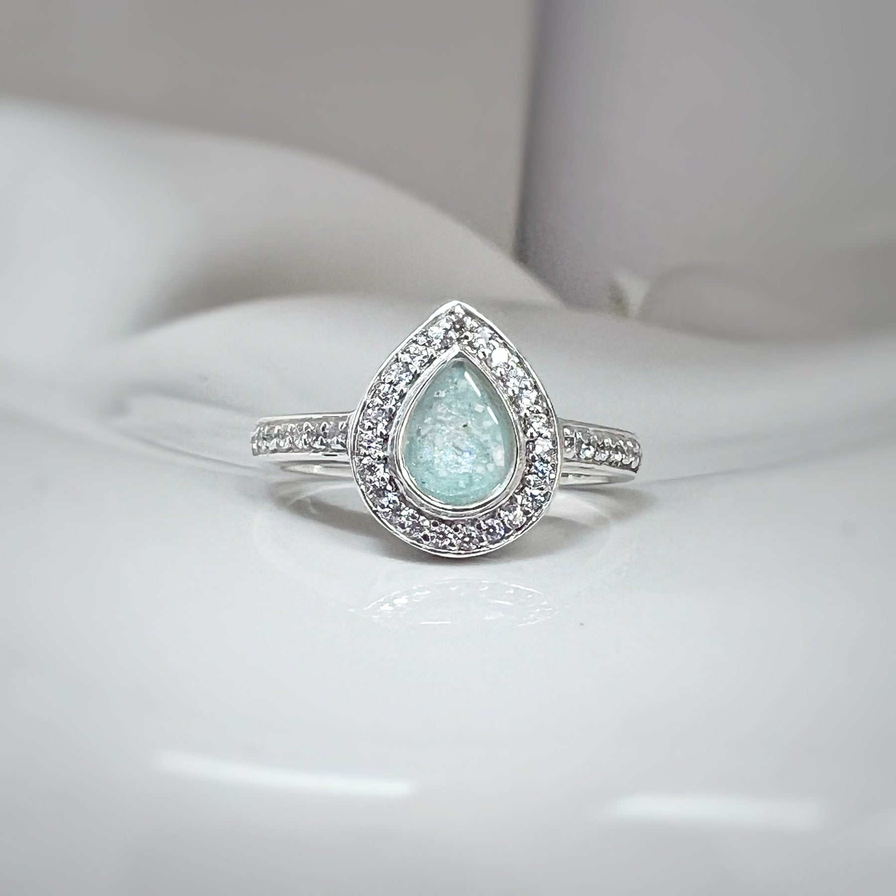 Regular price £230.00This beautiful teardrop memorial ashes ring is adorned with sparkling cz crystals surrounding the teardrop setting and along both shoulders. We will create a setting for a loved ones ashes or hair, or pet ashes, fur or horsehair within the teardrop.
