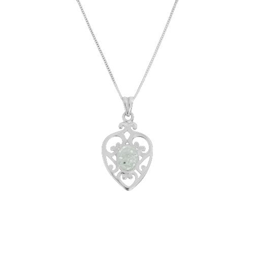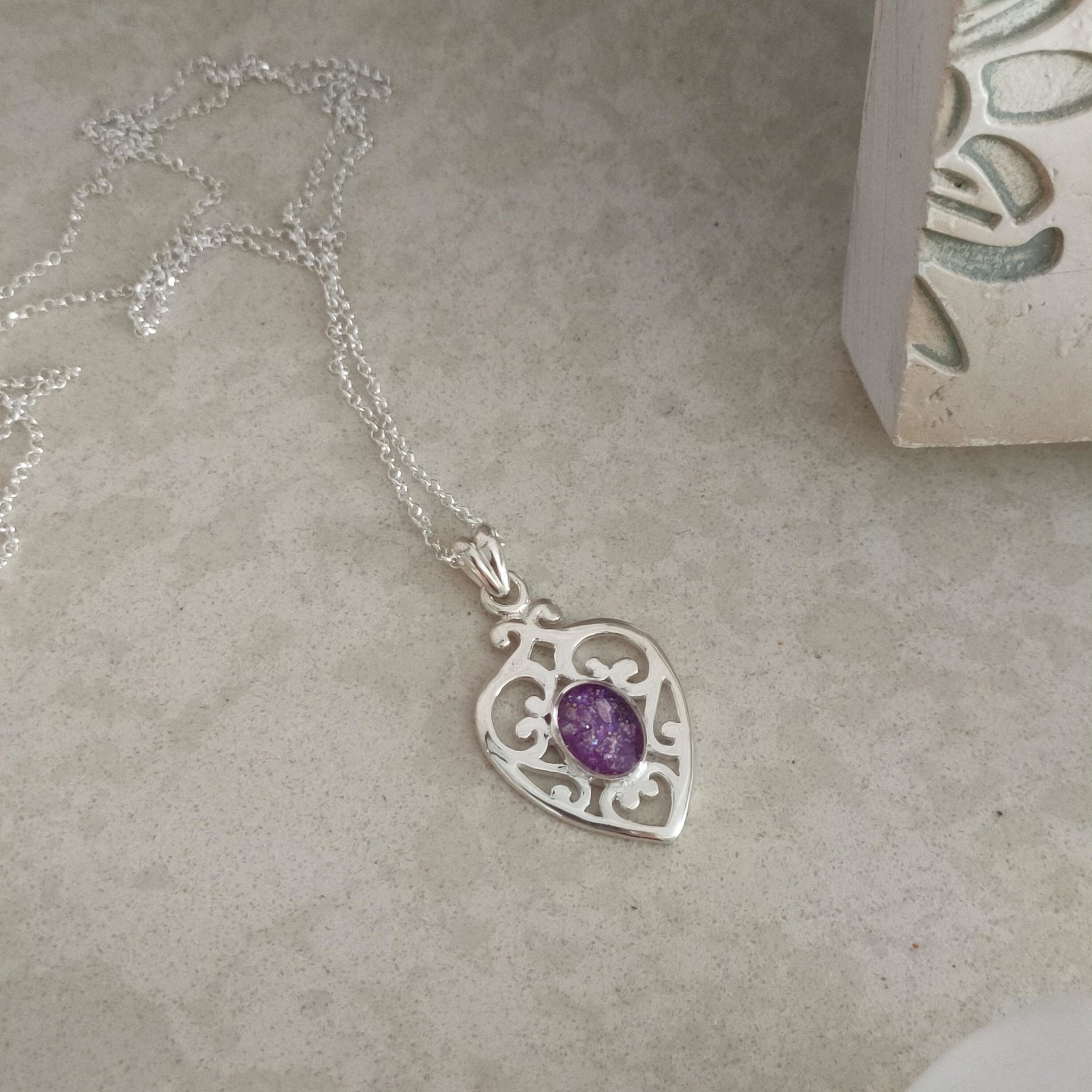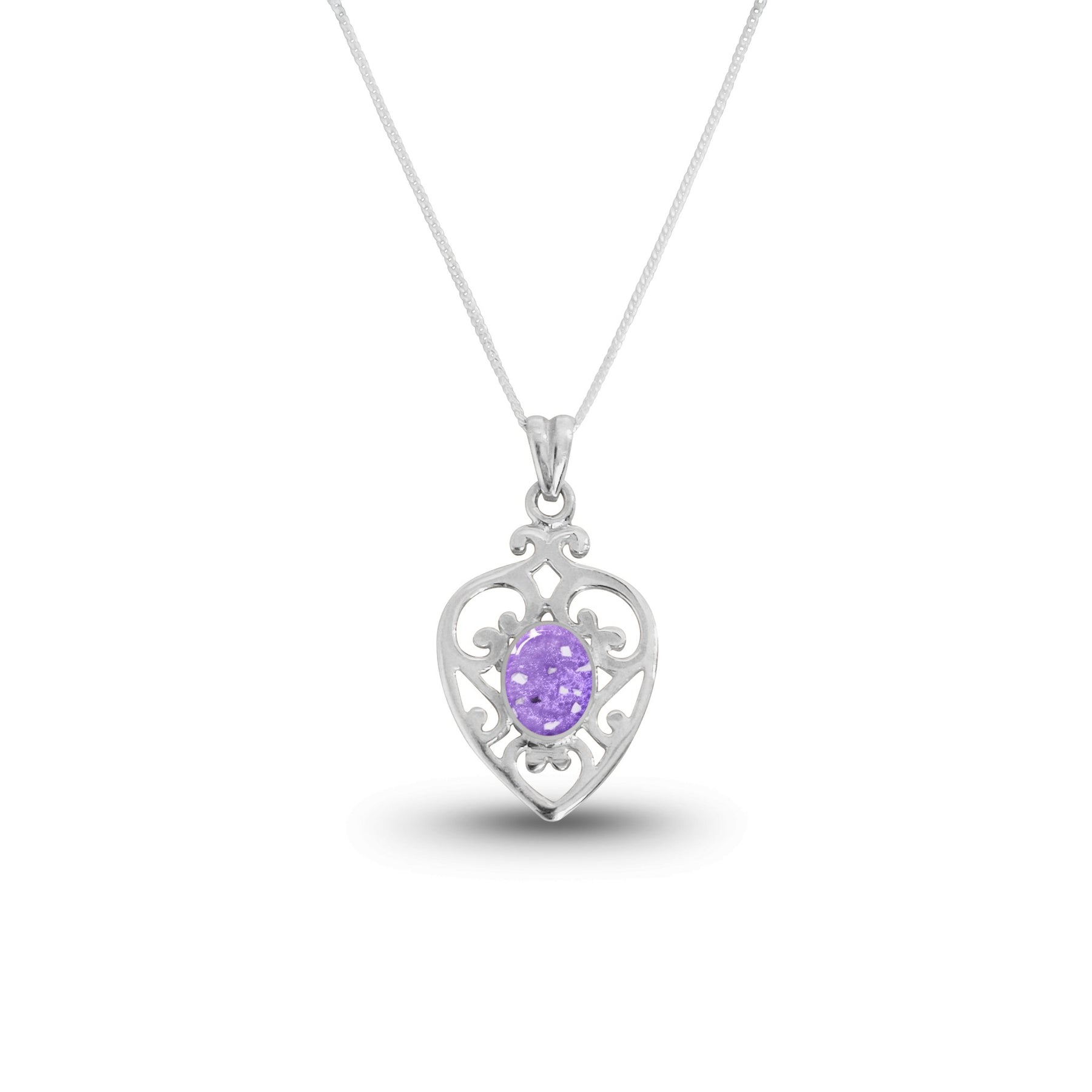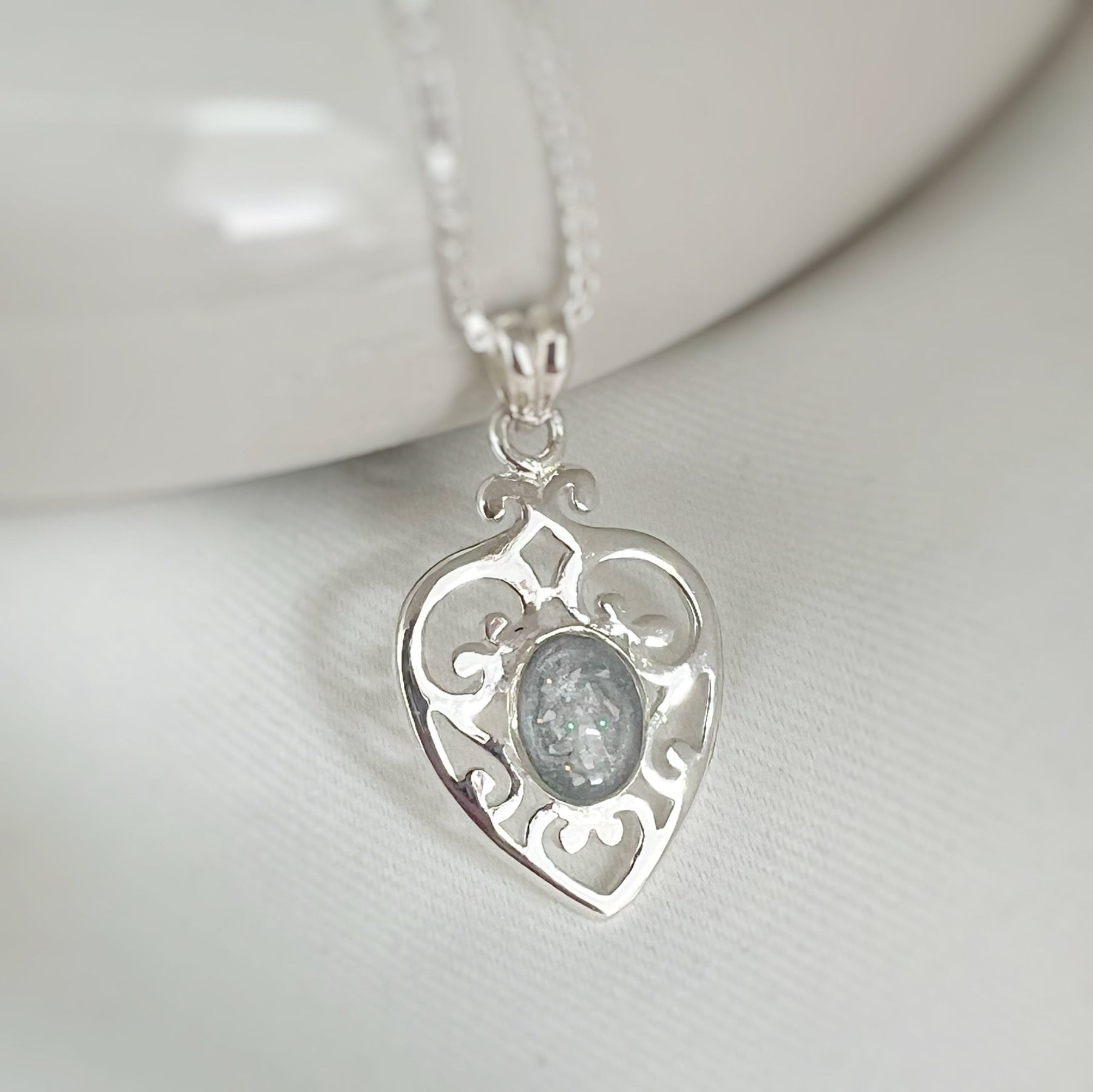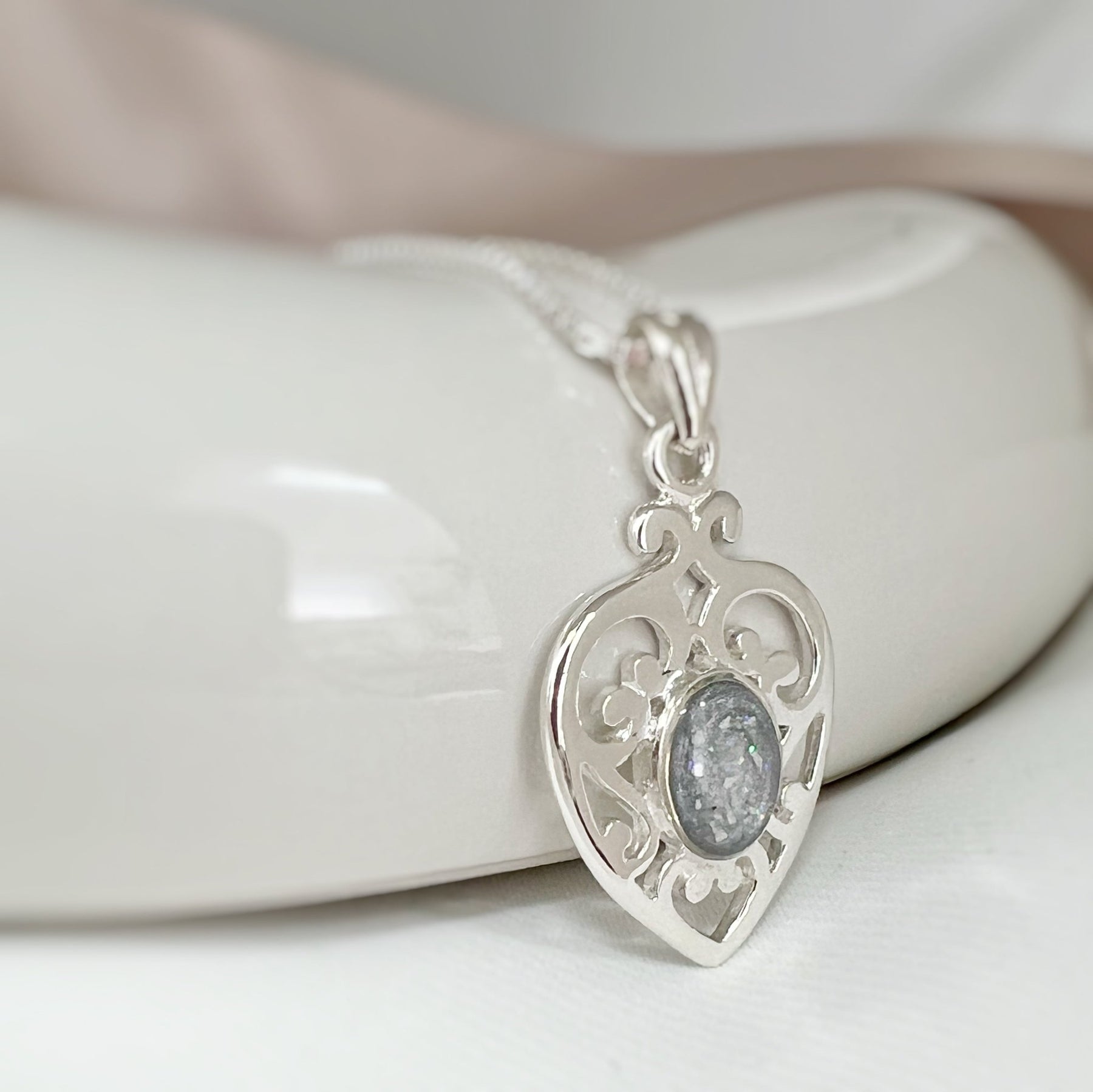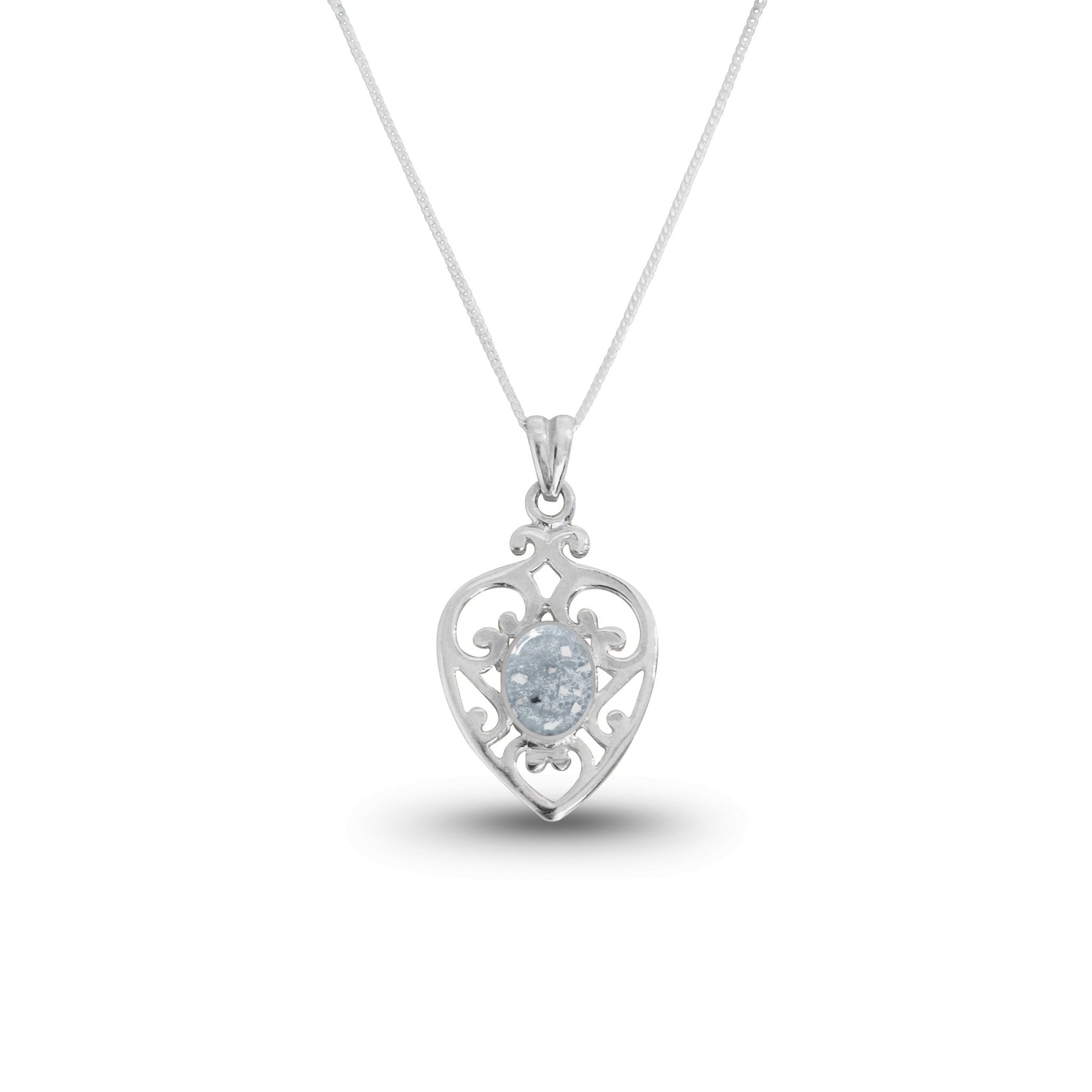 Regular price £179.00This stunning design fancy heart memorial ashes inclusions necklace has a beautiful scroll design surrounding the centre oval and measures 30mm x 20mm. Inclusions such as ashes, hair or fur will be placed securely and permanently inside the 8mm x 6mm oval centre piece.